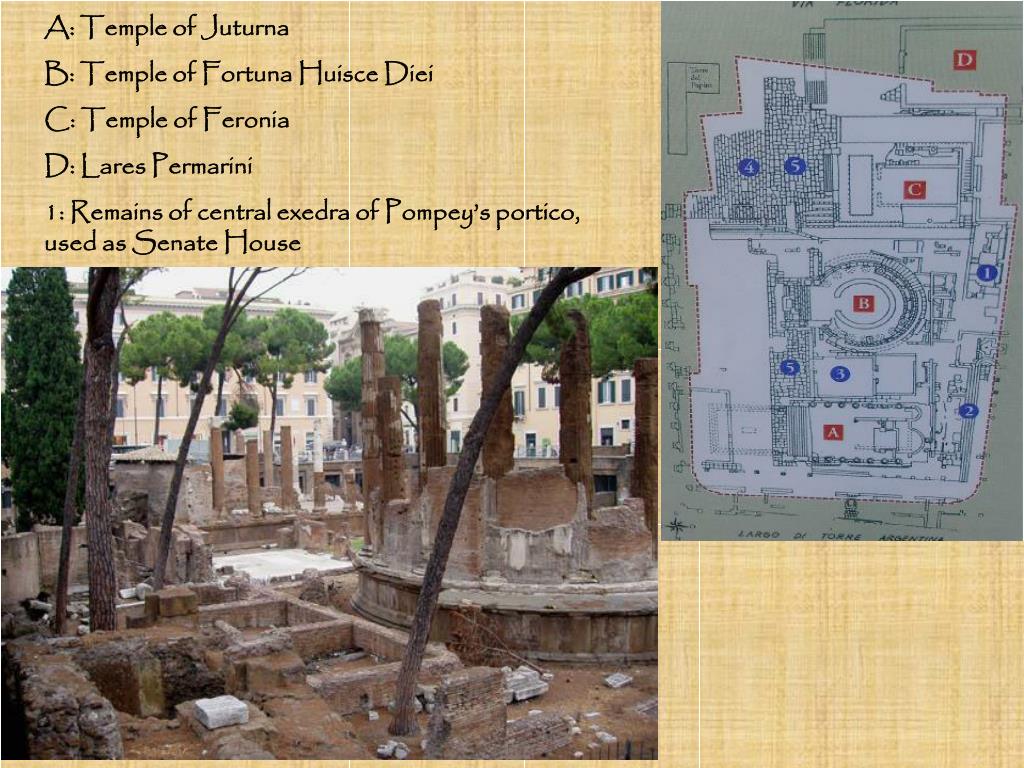 A: Temple of Juturna B: Temple of Fortuna Huisce Diei C: Temple of Feronia D: Lares Permarini 1: Remains of central exedra of Pompey’s portico, used as Senate House