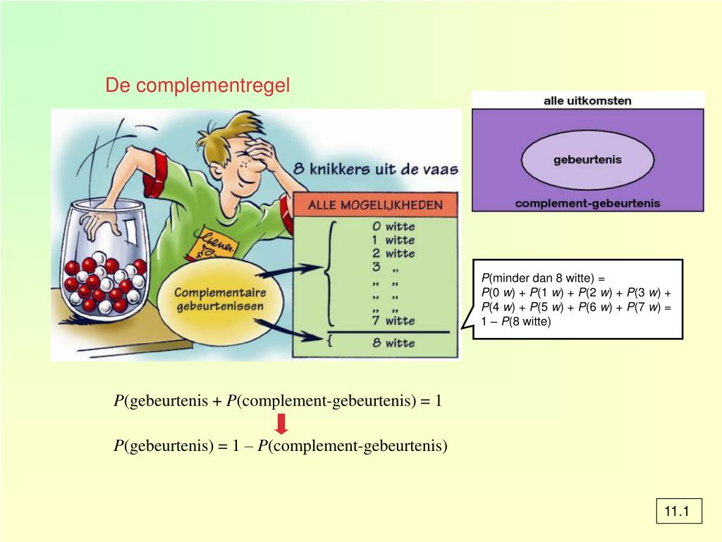De complementregel P(gebeurtenis + P(complement-gebeurtenis) = 1 P(gebeurtenis) = 1 – P(complement-gebeurtenis) P(minder dan 8 witte) = P(0 w) + P(1 w) + P(2 w) + P(3 w) + P(4 w) + P(5 w) + P(6 w) + P(7 w) = 1 – P(8 witte) 11.1