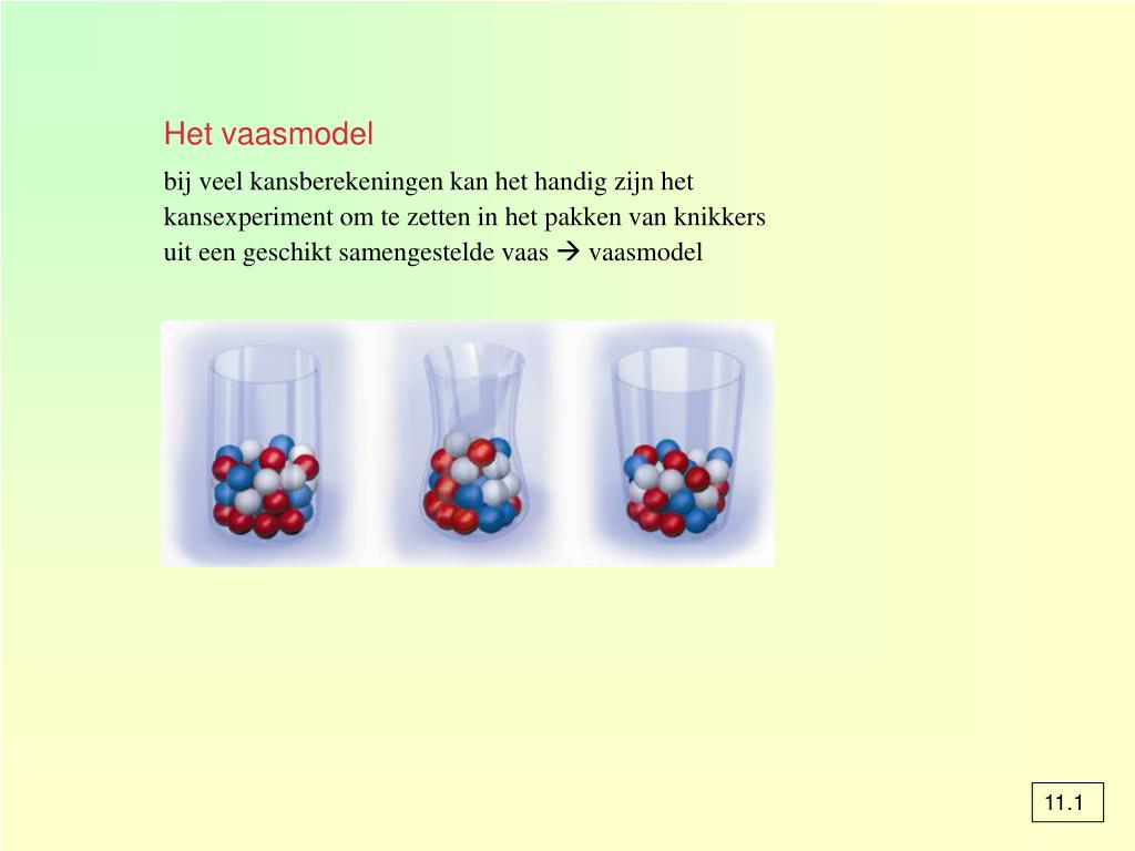 Het vaasmodel bij veel kansberekeningen kan het handig zijn het kansexperiment om te zetten in het pakken van knikkers uit een geschikt samengestelde vaas vaasmodel 11.1