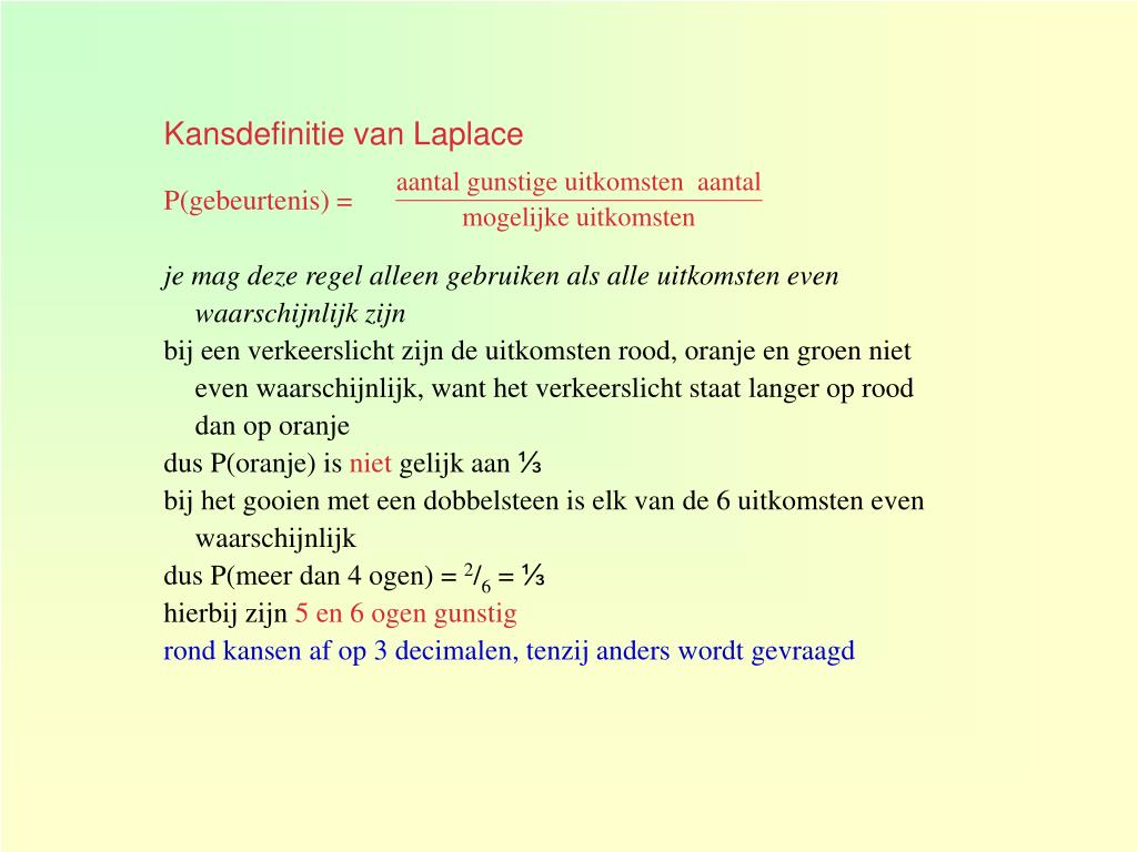 Kansdefinitie van Laplace aantal gunstige uitkomsten aantal mogelijke uitkomsten P(gebeurtenis) = je mag deze regel alleen gebruiken als alle uitkomsten even waarschijnlijk zijn bij een verkeerslicht zijn de uitkomsten rood, oranje en groen niet even waarschijnlijk, want het verkeerslicht staat langer op rood dan op oranje dus P(oranje) is niet gelijk aan ⅓ bij het gooien met een dobbelsteen is elk van de 6 uitkomsten even waarschijnlijk dus P(meer dan 4 ogen) = 2/6 = ⅓ hierbij zijn 5 en 6 ogen gunstig rond kansen af op 3 decimalen, tenzij anders wordt gevraagd