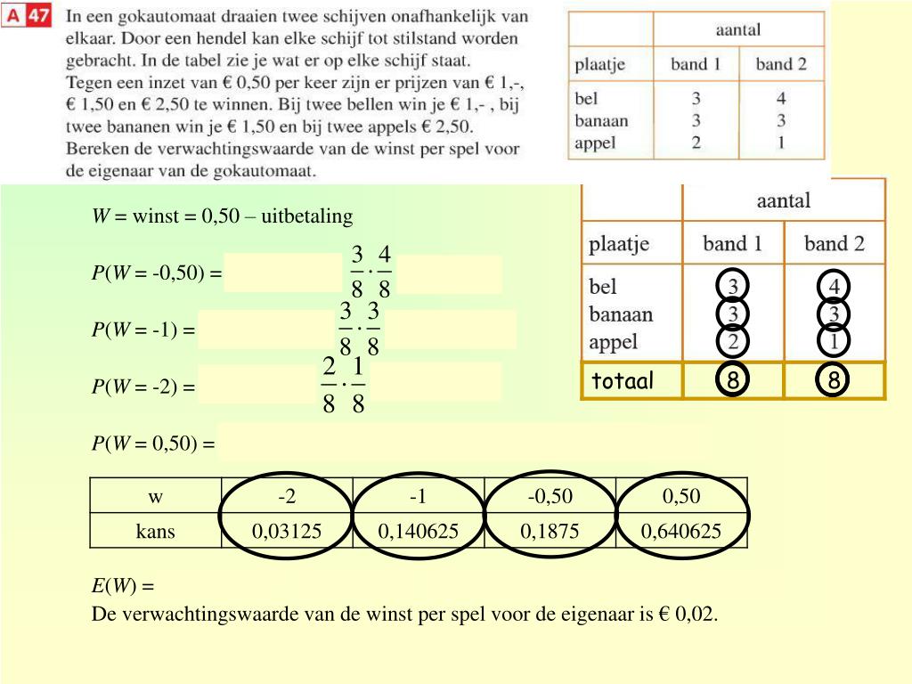 W = winst = 0,50 – uitbetaling P(W = -0,50) = P(2 bellen) = = 0,1875 P(W = -1) = P(2 bananen) = = 0,140625 P(W = -2) = P(2 appels) = = 0,03125 P(W = 0,50) = 1 – 0,1875 – 0,140625 – 0,03125 = 0,640625 E(W) = -2 · 0,03125 + -1 · 0,140625 + -0,50 · 0,1875 + 0,50 · 0,640625 = -0,02 De verwachtingswaarde van de winst per spelvoor de eigenaar is € 0,02.