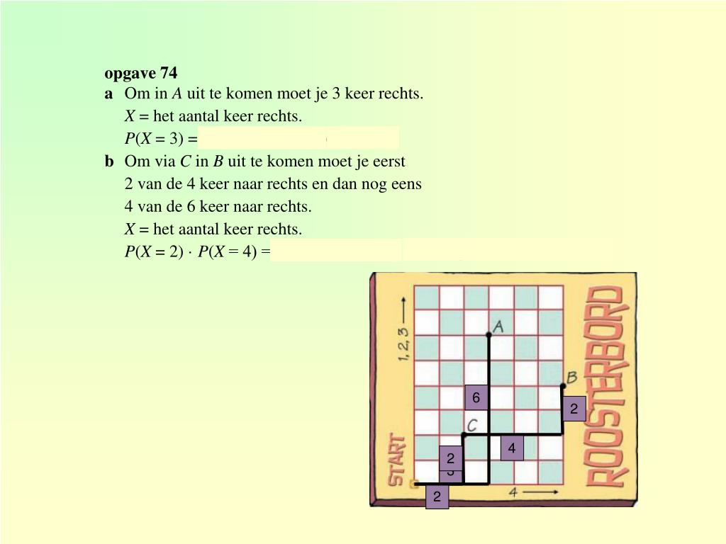opgave 74 a Om in A uit te komen moet je 3 keer rechts. X = het aantal keer rechts. P(X = 3) = binompdf(9, ¼, 3) ≈ 0,234 b Om via C in B uit te komen moet je eerst 2 van de 4 keer naar rechts en dan nog eens 4 van de 6 keer naar rechts. X = het aantal keer rechts. P(X = 2) · P(X = 4) = binompdf(4, ¼, 2) · binompdf(6, ¼, 4) ≈ 0,007 6 2 4 2 3 2