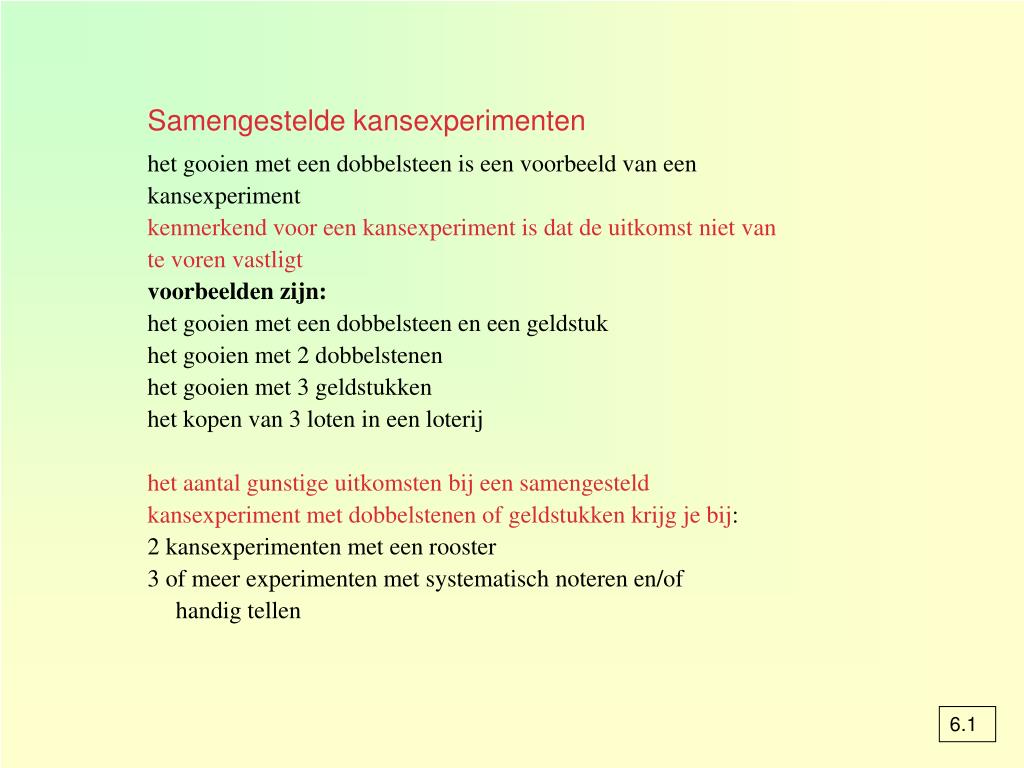 Samengestelde kansexperimenten het gooien met een dobbelsteen is een voorbeeld van een kansexperiment kenmerkend voor een kansexperiment is dat de uitkomst niet van te voren vastligt voorbeelden zijn: het gooien met een dobbelsteen en een geldstuk het gooien met 2 dobbelstenen het gooien met 3 geldstukken het kopen van 3 loten in een loterij het aantal gunstige uitkomsten bij een samengesteld kansexperiment met dobbelstenen of geldstukken krijg je bij: 2 kansexperimenten met een rooster 3 of meer experimenten met systematisch noteren en/of handig tellen 6.1