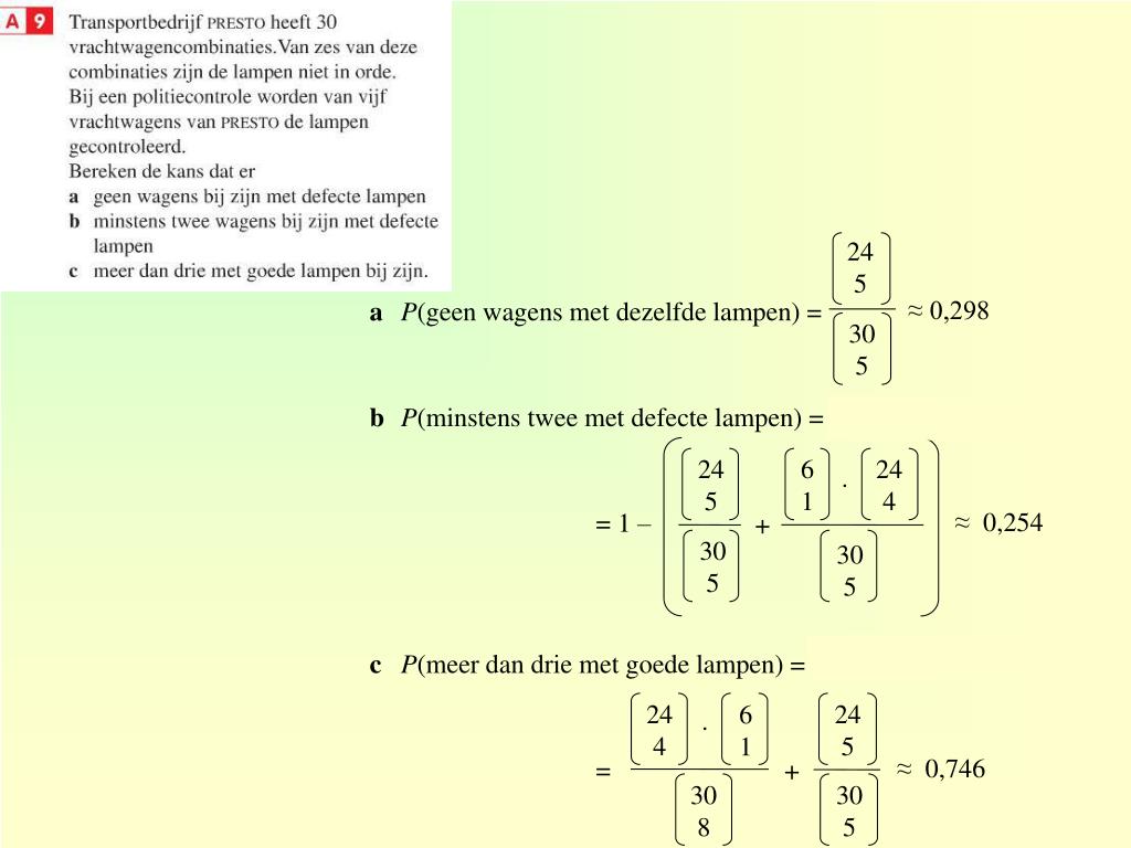 24 5 ≈ 0,298 a P(geen wagens met dezelfde lampen) = b P(minstens twee met defecte lampen) = 1 – (P(geen) + P(één)) = = 1 – c P(meer dan drie met goede lampen) = P(4) + P(5) = = 30 5 24 5 61 24 4 . ≈0,254 + 30 5 30 5 244 245 6 1 . ≈ 0,746 + 30 8 30 5