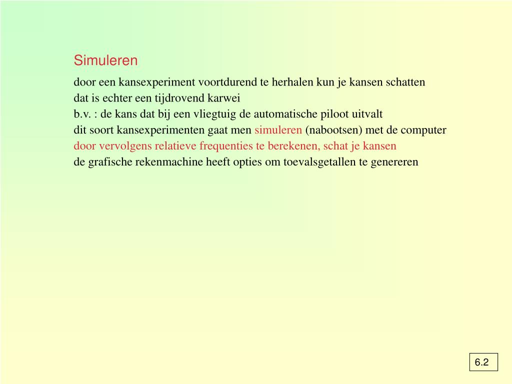 Simuleren door een kansexperiment voortdurend te herhalen kun je kansen schatten dat is echter een tijdrovend karwei b.v. : de kans dat bij een vliegtuig de automatische piloot uitvalt dit soort kansexperimenten gaat men simuleren (nabootsen) met de computer door vervolgens relatieve frequenties te berekenen, schat je kansen de grafische rekenmachine heeft opties om toevalsgetallen te genereren 6.2