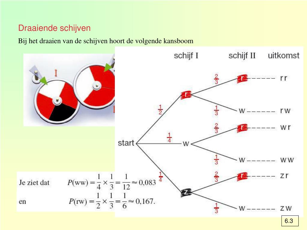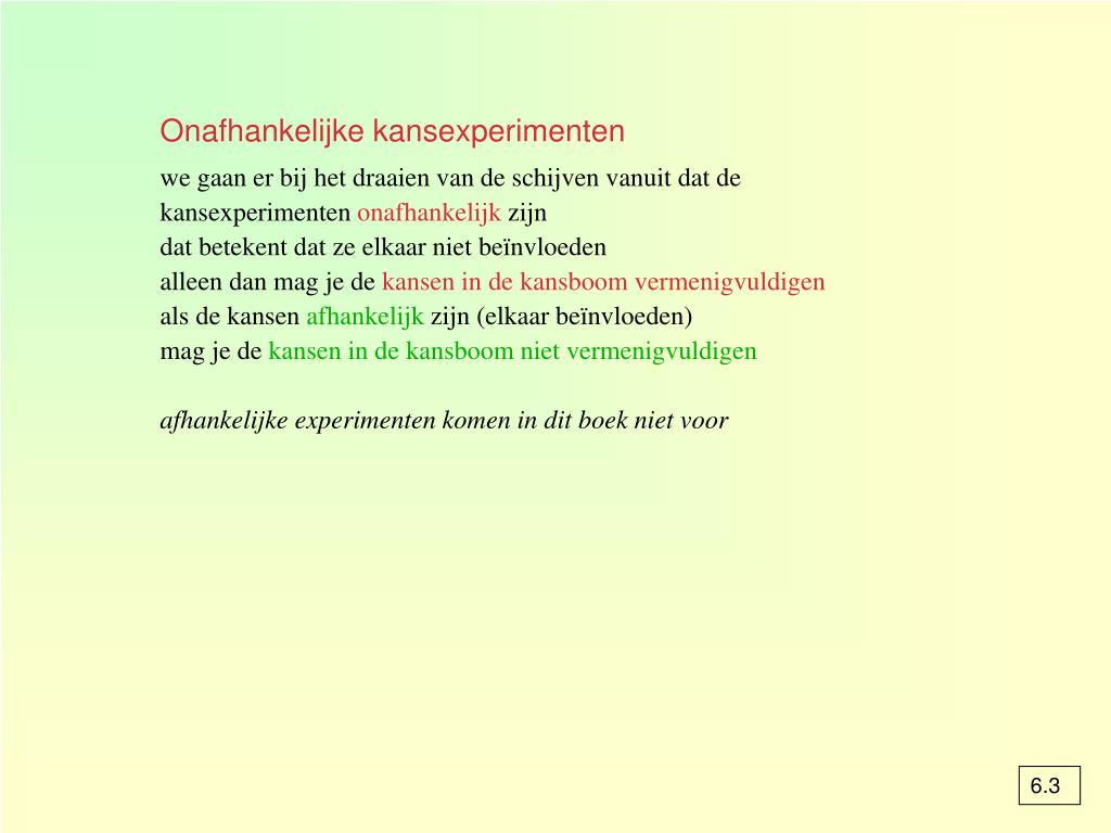 Onafhankelijke kansexperimenten we gaan er bij het draaien van de schijven vanuit dat de kansexperimenten onafhankelijk zijn dat betekent dat ze elkaar niet beïnvloeden alleen dan mag je de kansen in de kansboom vermenigvuldigen als de kansen afhankelijk zijn (elkaar beïnvloeden) mag je de kansen in de kansboom niet vermenigvuldigen afhankelijke experimenten komen in dit boek niet voor 6.3