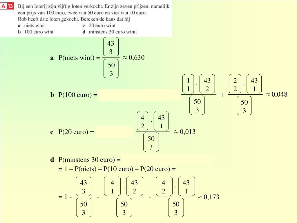 43 3 ≈ 0,630 a P(niets wint) = b P(100 euro) = P(1 x € 100) + P(2 x € 50) = c P(20 euro) = P(2 x € 10) = d P(minstens 30 euro) = 1 – P(minder dan 30 euro) = 1 – P(niets) – P(10 euro) – P(20 euro) = = 1 - 50 3 11 43 2 22 43 1 . . ≈ 0,048 + 50 3 50 3 42 43 1 . ≈ 0,013 50 3 43 3 41 43 2 42 43 1 . . - - ≈ 0,173 50 3 50 3 50 3