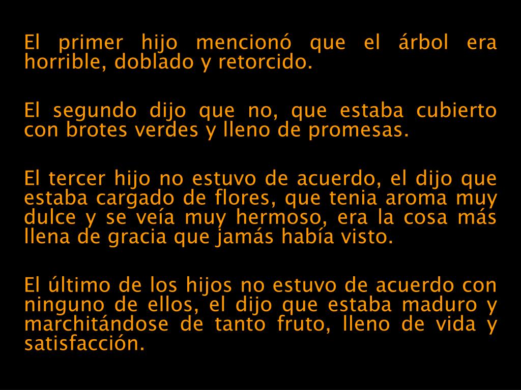 El primer hijo mencionó que el árbol era horrible, doblado y retorcido. El segundo dijo que no, que estaba cubierto con brotes verdes y lleno de promesas. El tercer hijo no estuvo de acuerdo, el dijo que estaba cargado de flores, que tenia aroma muy dulce y se veía muy hermoso, era la cosa más llena de gracia que jamás había visto. El último de los hijos no estuvo de acuerdo con ninguno de ellos, el dijo que estaba maduro y marchitándose de tanto fruto, lleno de vida y satisfacción.