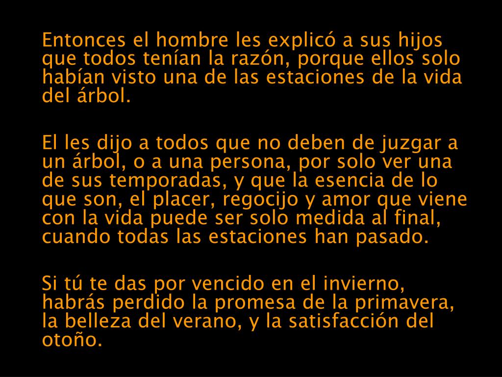 Entonces el hombre les explicó a sus hijos que todos tenían la razón, porque ellos solo habían visto una de las estaciones de la vida del árbol. El les dijo a todos que no deben de juzgar a un árbol, o a una persona, por solo ver una de sus temporadas, y que la esencia de lo que son, el placer, regocijo y amor que viene con la vida puede ser solo medida al final, cuando todas las estaciones han pasado. Si tú te das por vencido en el invierno, habrás perdido la promesa de la primavera, la belleza del verano, y la satisfacción del otoño.