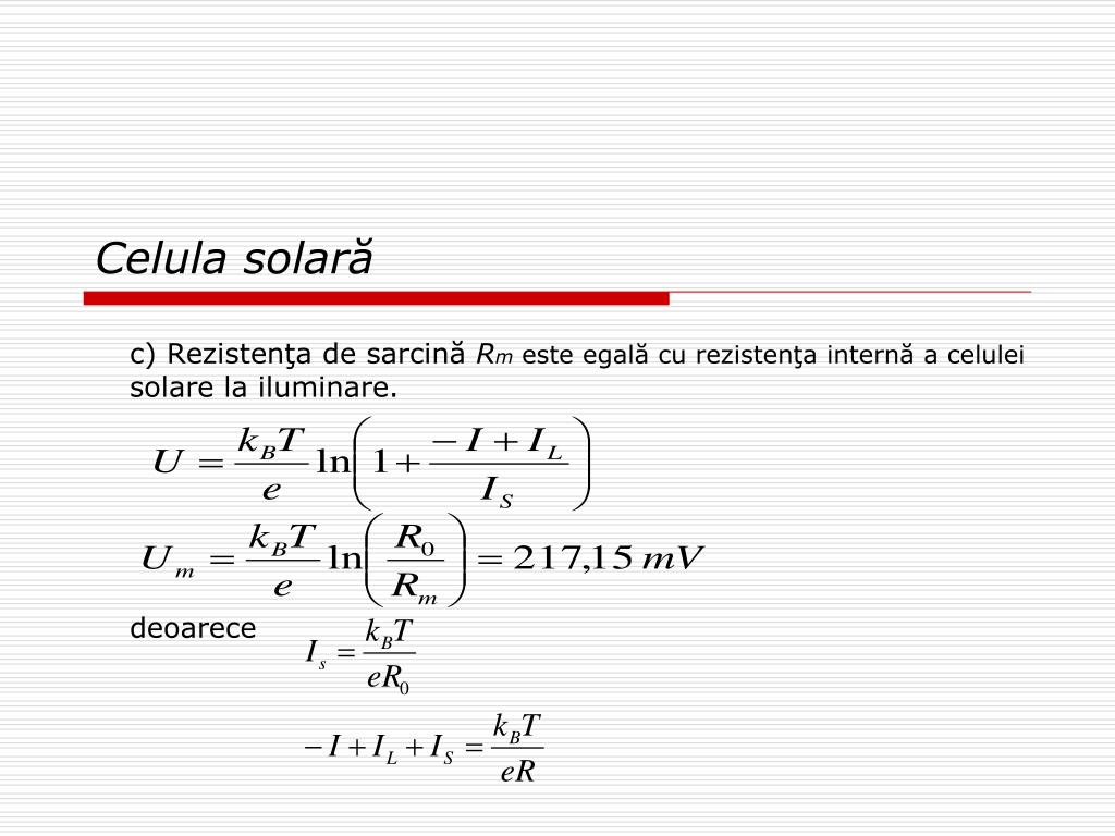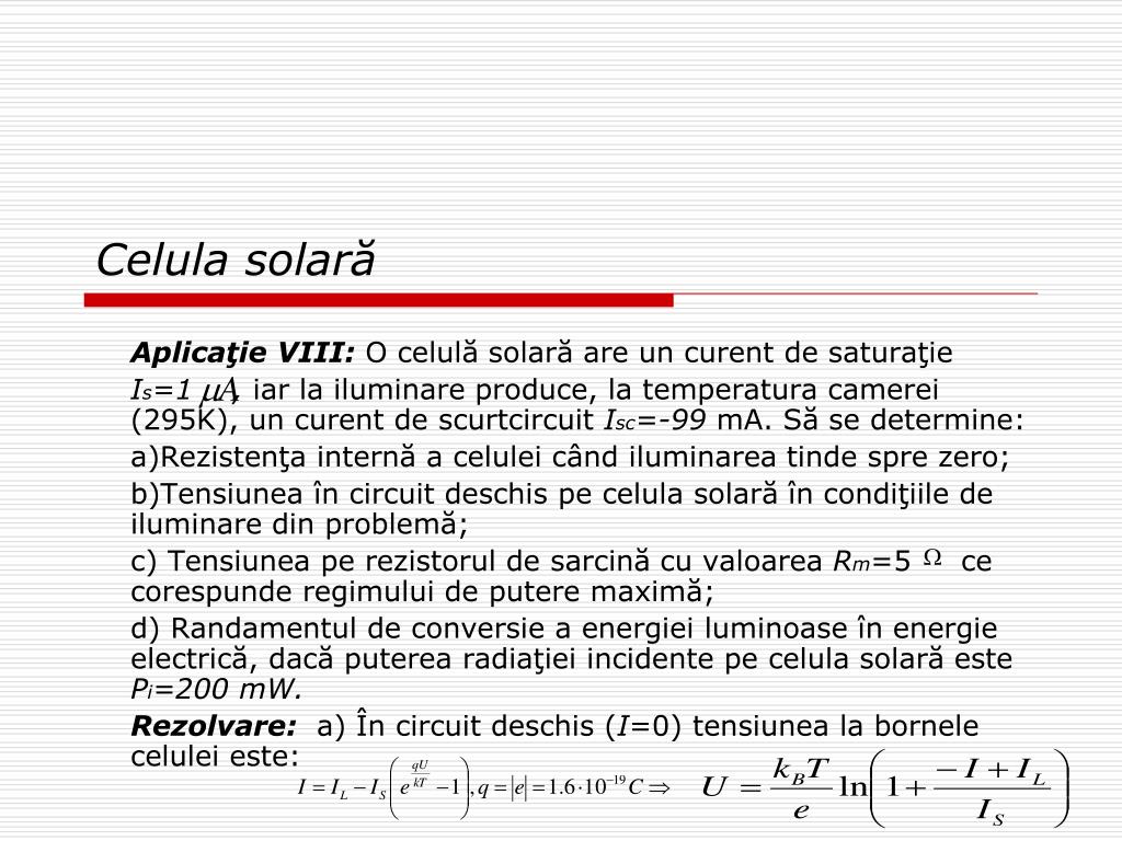 Celula solară Aplicaţie VIII: O celulăsolară are un curent de saturaţie Is=1 , iar la iluminare produce, la temperatura camerei (295K), un curent de scurtcircuit Isc=-99 mA. Să se determine: a)Rezistenţa internă a celulei când iluminarea tinde spre zero; b)Tensiunea în circuit deschis pe celula solară în condiţiile de iluminare din problemă; c) Tensiunea pe rezistorul de sarcină cu valoarea Rm=5 ce corespunde regimului de putere maximă; d) Randamentul de conversie a energiei luminoase în energie electrică, dacă puterea radiaţiei incidente pe celula solară este Pi=200 mW. Rezolvare: a) În circuit deschis (I=0) tensiunea la bornele celulei este: