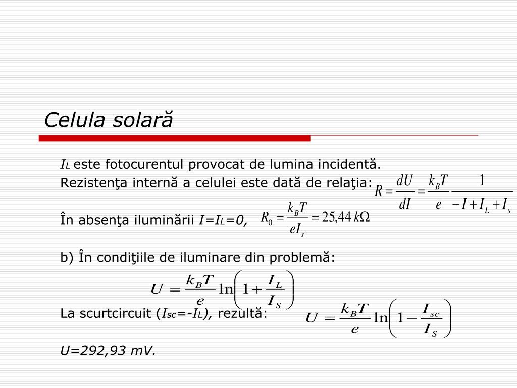 Celula solară ILeste fotocurentul provocat de lumina incidentă. Rezistenţa internă a celulei este dată de relaţia: În absenţa iluminării I=IL=0, b) În condiţiile de iluminare din problemă: La scurtcircuit (Isc=-IL), rezultă: U=292,93 mV.