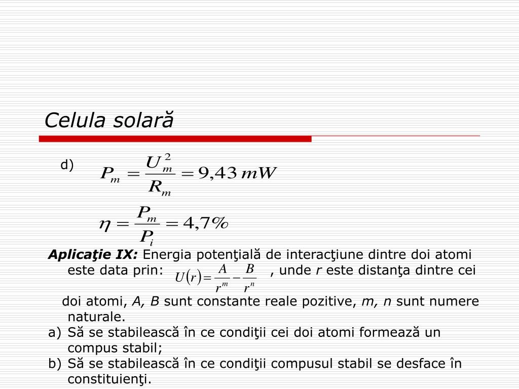 Celula solară d) • Aplicaţie IX: Energia potenţială de interacţiune dintre doi atomi este data prin: , unde r este distanţa dintre cei • doi atomi, A, B sunt constante reale pozitive, m, n sunt numere naturale. • Să se stabilească în ce condiţii cei doi atomi formează un compus stabil; • Să se stabilească în ce condiţii compusul stabil se desface în constituienţi.
