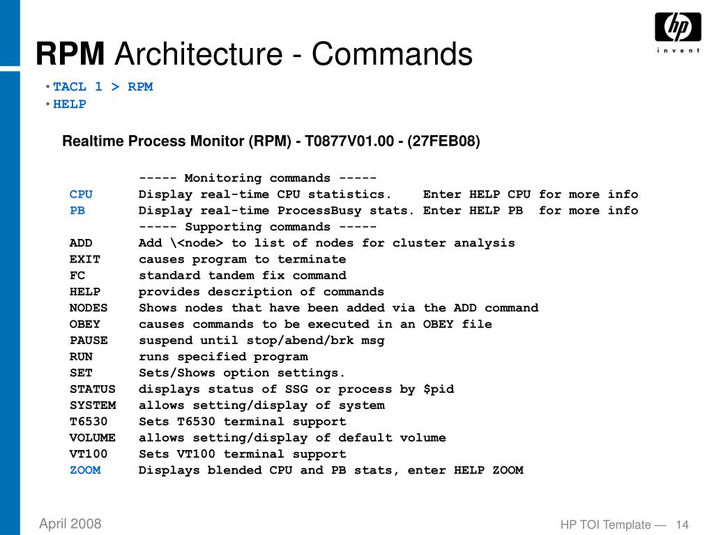 RPM Product Overview • Market position and rollout • RPM is a point-product • Designed to do one thing well, real-time process monitor alerts & display • Applicable to all customers, old or new, runs on H-series, S-series, D-series • Applicable regardless of what products customers have today • Multi-node, multi-operating-system, multi-device aware • Provides unique capabilities that do not exist otherwise on NonStop • Triple binaries can run on H06, G06, D42+ operating systems. • Built based on long term development experience, and need to understand real-time dynamics of software in a network. • Evolved and refined over a multi-year period in HP Labs • Reached a point where customers started asking for it • RPM is evolved tool, more stable than typical NPV products. • Availability • Plan of Record - FCS May 15, 2008 HP TOI Template —