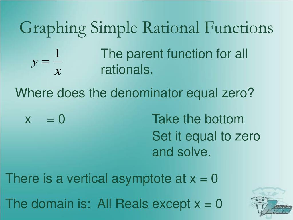Graphing Simple Rational Functions The parent function for all rationals. Where does the denominator equal zero? x = 0 Take the bottom Set it equal to zero and solve. There is a vertical asymptote at x = 0 The domain is: All Reals except x = 0