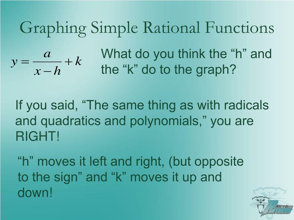 Graphing Simple Rational Functions What do you think the “h” and the “k” do to the graph? If you said, “The same thing as with radicals and quadratics and polynomials,” you are RIGHT! “h” moves it left and right, (but opposite to the sign” and “k” moves it up and down!