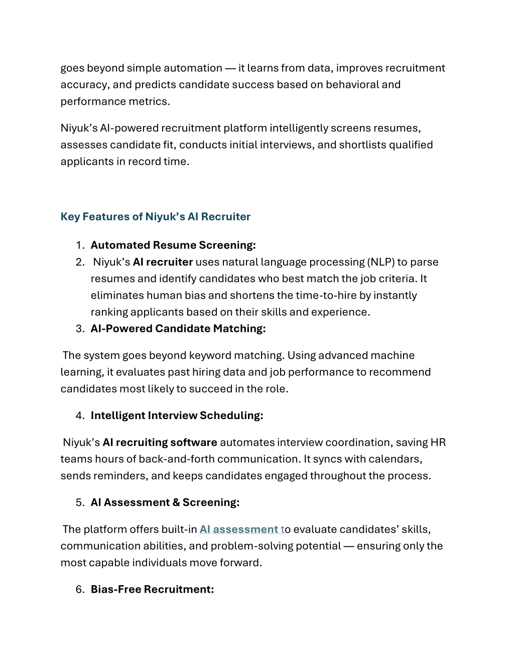 goes beyond simple automation — it learns from data, improves recruitment accuracy, and predicts candidate success based on behavioral and performance metrics. Niyuk’s AI-powered recruitment platform intelligently screens resumes, assesses candidate fit, conducts initial interviews, and shortlists qualified applicants in record time. Key Features of Niyuk’s AI Recruiter 1.Automated Resume Screening: 2.Niyuk’s AI recruiter uses natural language processing (NLP) to parse resumes and identify candidates who best match the job criteria. It eliminates human bias and shortens the time-to-hire by instantly ranking applicants based on their skills and experience. 3.AI-Powered Candidate Matching: The system goes beyond keyword matching. Using advanced machine learning, it evaluates past hiring data and job performance to recommend candidates most likely to succeed in the role. 4.Intelligent Interview Scheduling: Niyuk’s AI recruiting software automates interview coordination, saving HR teams hours of back-and-forth communication. It syncs with calendars, sends reminders, and keeps candidates engaged throughout the process. 5.AI Assessment & Screening: The platform offers built-in AI assessment to evaluate candidates’ skills, communication abilities, and problem-solving potential — ensuring only the most capable individuals move forward. 6.Bias-Free Recruitment: