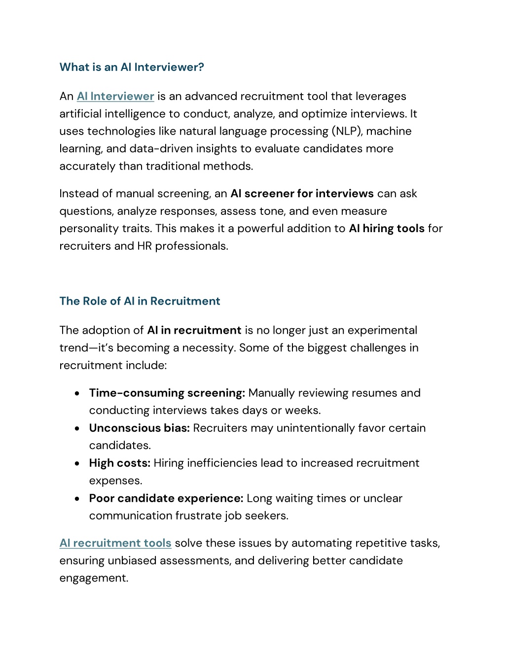 What is an AI Interviewer? An AI Interviewer is an advanced recruitment tool that leverages artificial intelligence to conduct, analyze, and optimize interviews. It uses technologies like natural language processing (NLP), machine learning, and data-driven insights to evaluate candidates more accurately than traditional methods. Instead of manual screening, an AI screener for interviews can ask questions, analyze responses, assess tone, and even measure personality traits. This makes it a powerful addition to AI hiring tools for recruiters and HR professionals. The Role of AI in Recruitment The adoption of AI in recruitment is no longer just an experimental trend—it’s becoming a necessity. Some of the biggest challenges in recruitment include: •Time-consuming screening: Manually reviewing resumes and conducting interviews takes days or weeks. •Unconscious bias: Recruiters may unintentionally favor certain candidates. •High costs: Hiring inefficiencies lead to increased recruitment expenses. •Poor candidate experience: Long waiting times or unclear communication frustrate job seekers. AI recruitment tools solve these issues by automating repetitive tasks, ensuring unbiased assessments, and delivering better candidate engagement.