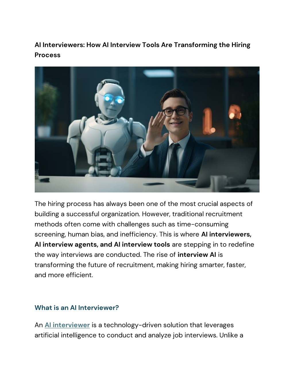 AI Interviewers: How AI Interview Tools Are Transforming the Hiring Process The hiring process has always been one of the most crucial aspects of building a successful organization. However, traditional recruitment methods often come with challenges such as time-consuming screening, human bias, and inefficiency. This is where AI interviewers, AI interview agents, and AI interview tools are stepping in to redefine the way interviews are conducted. The rise of interview AI is transforming the future of recruitment, making hiring smarter, faster, and more efficient. What is an AI Interviewer? An AI interviewer is a technology-driven solution that leverages artificial intelligence to conduct and analyze job interviews. Unlike a