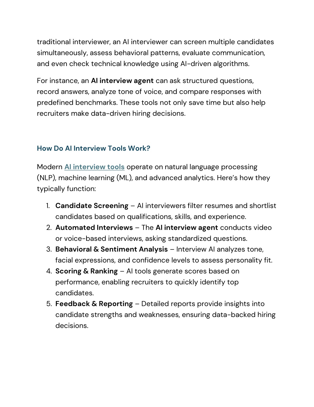 traditional interviewer, an AI interviewer can screen multiple candidates simultaneously, assess behavioral patterns, evaluate communication, and even check technical knowledge using AI-driven algorithms. For instance, an AI interview agent can ask structured questions, record answers, analyze tone of voice, and compare responses with predefined benchmarks. These tools not only save time but also help recruiters make data-driven hiring decisions. How Do AI Interview Tools Work? Modern AI interview tools operate on natural language processing (NLP), machine learning (ML), and advanced analytics. Here’s how they typically function: 1.Candidate Screening– AI interviewers filter resumes and shortlist candidates based on qualifications, skills, and experience. 2.Automated Interviews– The AI interview agent conducts video or voice-based interviews, asking standardized questions. 3.Behavioral & Sentiment Analysis– Interview AI analyzes tone, facial expressions, and confidence levels to assess personality fit. 4.Scoring & Ranking– AI tools generate scores based on performance, enabling recruiters to quickly identify top candidates. 5.Feedback & Reporting– Detailed reports provide insights into candidate strengths and weaknesses, ensuring data-backed hiring decisions.
