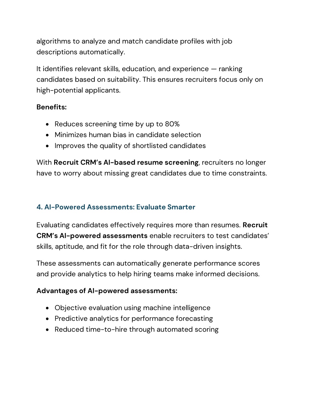 algorithms to analyze and match candidate profiles with job descriptions automatically. It identifies relevant skills, education, and experience — ranking candidates based on suitability. This ensures recruiters focus only on high-potential applicants. Benefits: •Reduces screening time by up to 80% •Minimizes human bias in candidate selection •Improves the quality of shortlisted candidates With Recruit CRM’s AI-based resume screening, recruiters no longer have to worry about missing great candidates due to time constraints. 4. AI-Powered Assessments: Evaluate Smarter Evaluating candidates effectively requires more than resumes. Recruit CRM’s AI-powered assessmentsenable recruiters to test candidates’ skills, aptitude, and fit for the role through data-driven insights. These assessments can automatically generate performance scores and provide analytics to help hiring teams make informed decisions. Advantages of AI-powered assessments: •Objective evaluation using machine intelligence •Predictive analytics for performance forecasting •Reduced time-to-hire through automated scoring