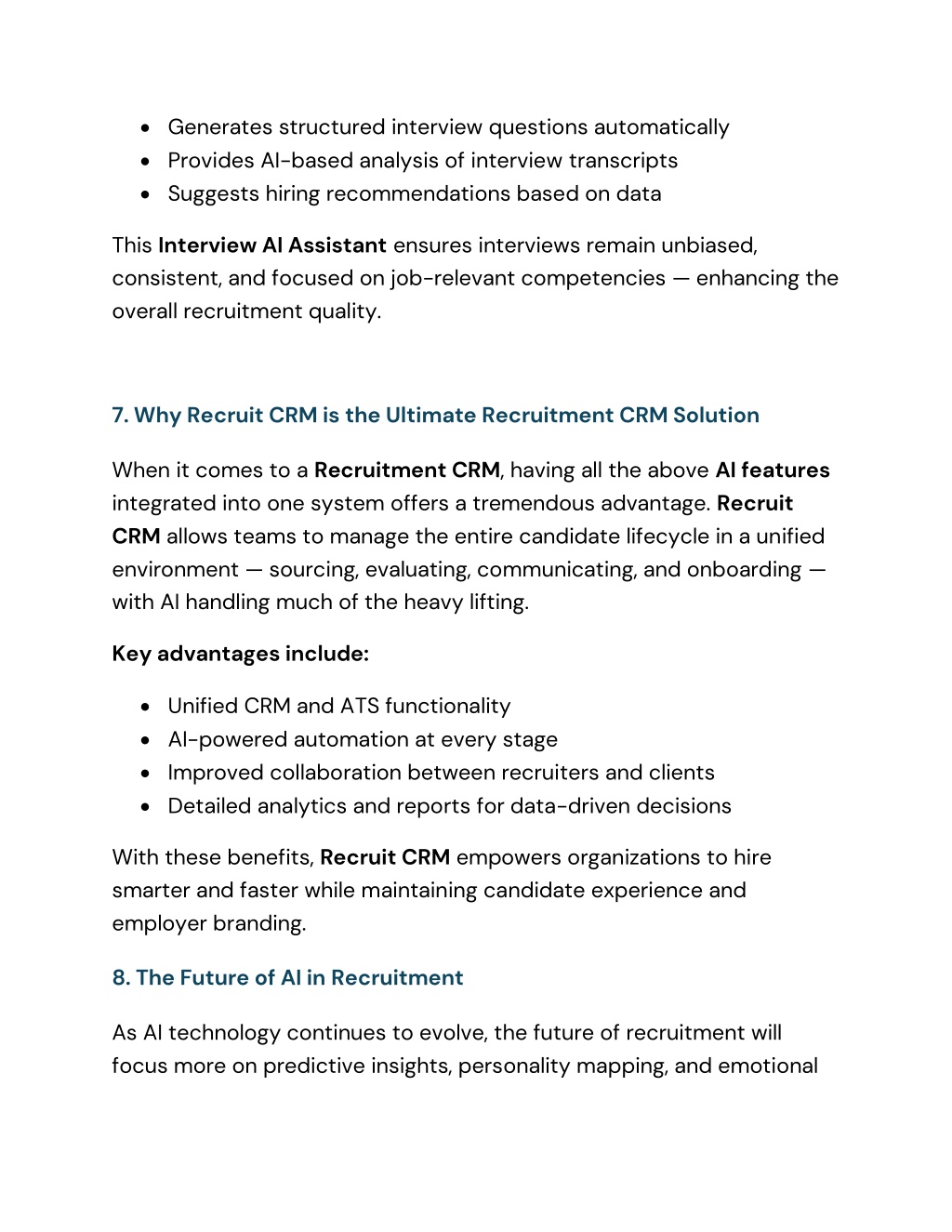 •Generates structured interview questions automatically •Provides AI-based analysis of interview transcripts •Suggests hiring recommendations based on data This Interview AI Assistant ensures interviews remain unbiased, consistent, and focused on job-relevant competencies — enhancing the overall recruitment quality. 7. Why Recruit CRM is the Ultimate Recruitment CRM Solution When it comes to a Recruitment CRM, having all the above AI features integrated into one system offers a tremendous advantage. Recruit CRM allows teams to manage the entire candidate lifecycle in a unified environment — sourcing, evaluating, communicating, and onboarding — with AI handling much of the heavy lifting. Key advantages include: •Unified CRM and ATS functionality •AI-powered automation at every stage •Improved collaboration between recruiters and clients •Detailed analytics and reports for data-driven decisions With these benefits, Recruit CRM empowers organizations to hire smarter and faster while maintaining candidate experience and employer branding. 8. The Future of AI in Recruitment As AI technology continues to evolve, the future of recruitment will focus more on predictive insights, personality mapping, and emotional