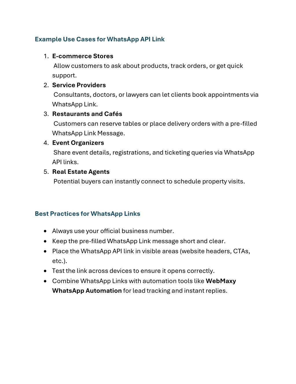 Example Use Cases for WhatsApp API Link 1.E-commerce Stores Allow customers to ask about products, track orders, or get quick support. 2.Service Providers Consultants, doctors, or lawyers can let clients book appointments via WhatsApp Link. 3.Restaurants and Cafés Customers can reserve tables or place delivery orders with a pre-filled WhatsApp Link Message. 4.Event Organizers Share event details, registrations, and ticketing queries via WhatsApp API links. 5.Real Estate Agents Potential buyers can instantly connect to schedule property visits. Best Practices for WhatsApp Links •Always use your official business number. •Keep the pre-filled WhatsApp Link message short and clear. •Place the WhatsApp API link in visible areas (website headers, CTAs, etc.). •Test the link across devices to ensure it opens correctly. •Combine WhatsApp Links with automation tools like WebMaxy WhatsApp Automation for lead tracking and instant replies.