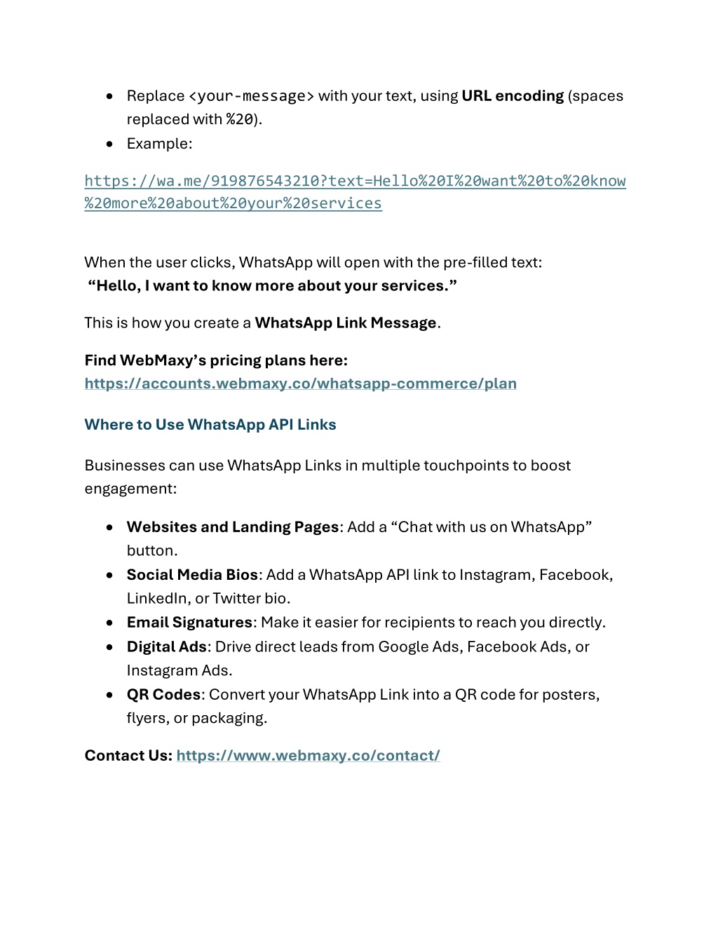 •Replace <your-message> with your text, using URL encoding (spaces replaced with %20). •Example: https://wa.me/919876543210?text=Hello%20I%20want%20to%20know %20more%20about%20your%20services When the user clicks, WhatsApp will open with the pre-filled text: “Hello, I want to know more about your services.” This is how you create a WhatsApp Link Message. Find WebMaxy’s pricing plans here: https://accounts.webmaxy.co/whatsapp-commerce/plan Where to Use WhatsApp API Links Businesses can use WhatsApp Links in multiple touchpoints to boost engagement: •Websites and Landing Pages: Add a “Chat with us on WhatsApp” button. •Social Media Bios: Add a WhatsApp API link to Instagram, Facebook, LinkedIn, or Twitter bio. •Email Signatures: Make it easier for recipients to reach you directly. •Digital Ads: Drive direct leads from Google Ads, Facebook Ads, or Instagram Ads. •QR Codes: Convert your WhatsApp Link into a QR code for posters, flyers, or packaging. Contact Us: https://www.webmaxy.co/contact/