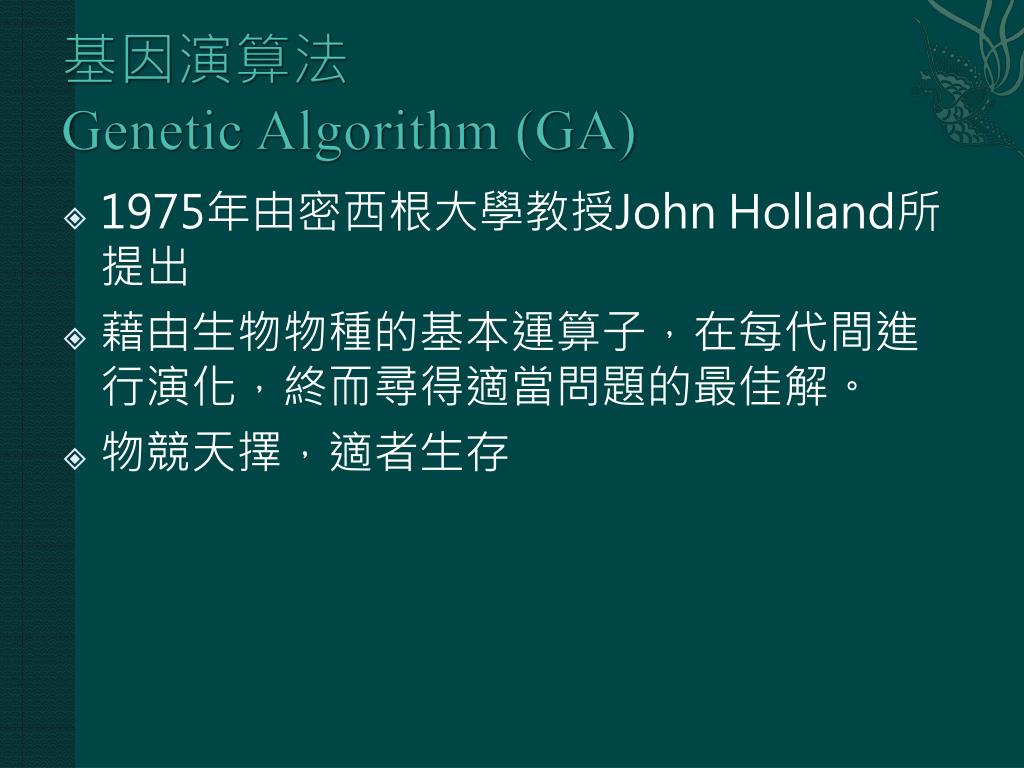基因演算法Genetic Algorithm (GA) • 1975年由密西根大學教授John Holland所提出 • 藉由生物物種的基本運算子,在每代間進行演化,終而尋得適當問題的最佳解。 • 物競天擇,適者生存