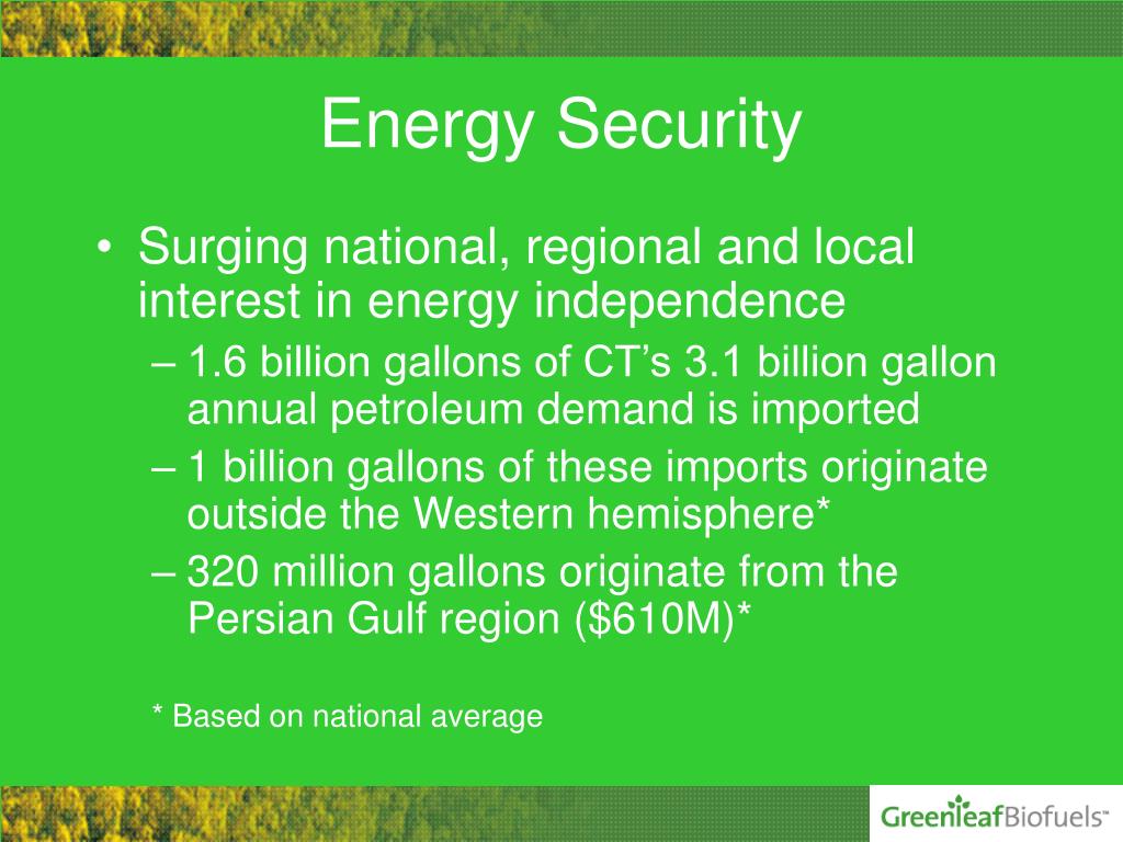 Surging national, regional and local interest in energy independence 1.6 billion gallons of CT’s 3.1 billion gallon annual petroleum demand is imported 1 billion gallons of these imports originate outside the Western hemisphere* 320 million gallons originate from the Persian Gulf region ($610M)* * Based on national average Energy Security