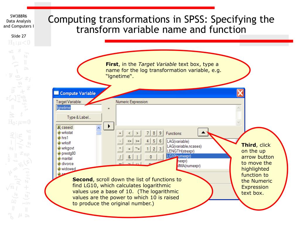 Computing transformations in SPSS: Specifying the transform variable name and function First, in the Target Variable text box, type a name for the log transformation variable, e.g. “lgnetime“. Third, click on the up arrow button to move the highlighted function to the Numeric Expression text box. Second, scroll down the list of functions to find LG10, which calculates logarithmic values use a base of 10. (The logarithmic values are the power to which 10 is raised to produce the original number.)