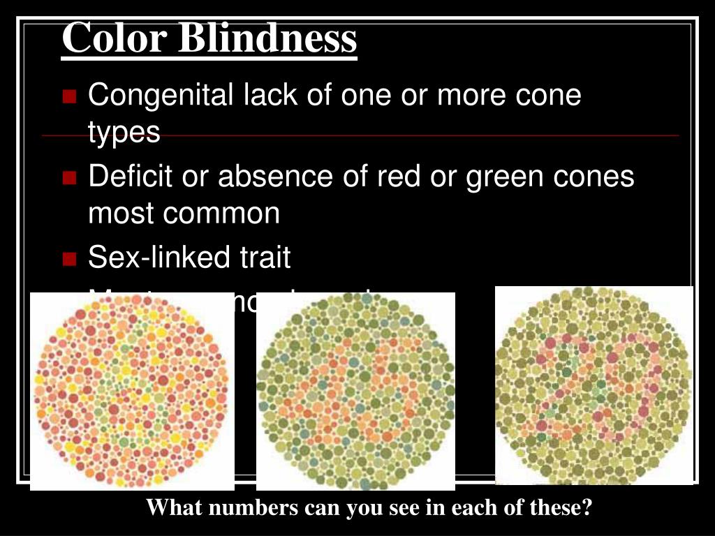 Color Blindness • Congenital lack of one or more cone types • Deficit or absence of red or green cones most common • Sex-linked trait • Most common in males What numbers can you see in each of these?