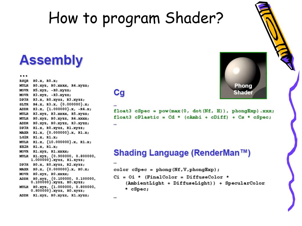 Math ops: USE THEM ! cos(x)/log2(x)/pow(x,y) dot(a,b) mul(v, M) sqrt(x)/rsqrt(x) cross(u, v) Using built-in ops is more efficient than writing your own Swizzling/masking: an easy way to move data around. v1 = (4,-2,5,3); // Initialize v2 = v1.yx; // v2 = (-2,4) s = v1.w; // s = 3 v3 = s.rrr; // v3 = (3,3,3) The fragment pipeline