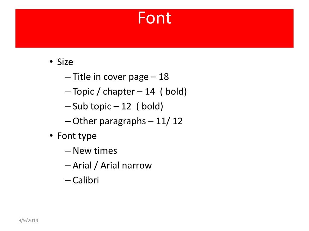 Font • Size • Title in cover page – 18 • Topic / chapter – 14 ( bold) • Sub topic – 12 ( bold) • Other paragraphs – 11/ 12 • Font type • New times • Arial / Arial narrow • Calibri