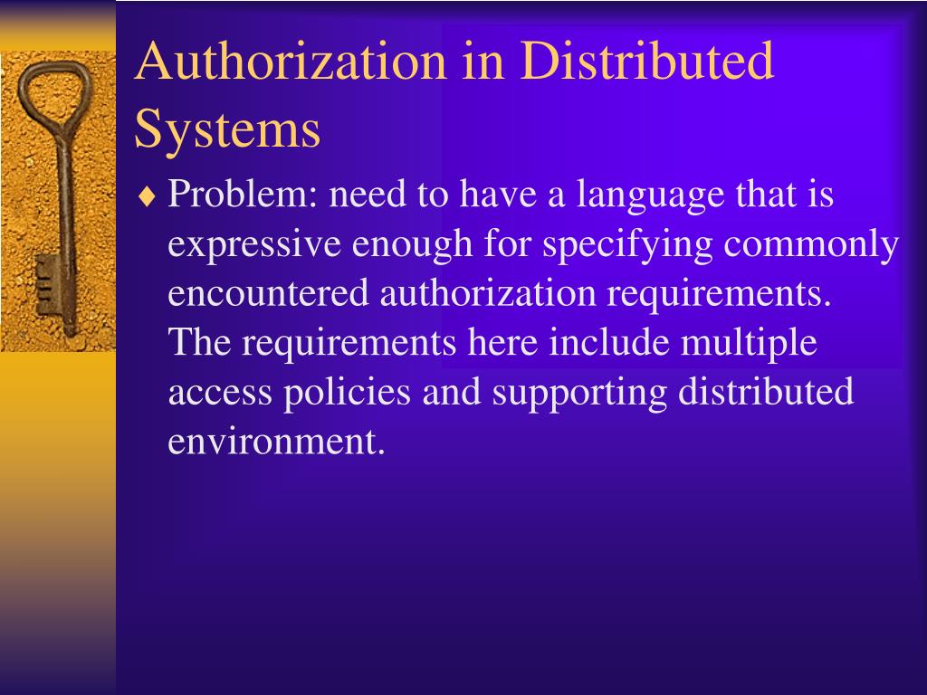 Authorization in Distributed Systems • Problem: need to have a language that is expressive enough for specifying commonly encountered authorization requirements. The requirements here include multiple access policies and supporting distributed environment.