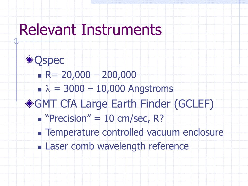 Relevant Instruments • Qspec • R= 20,000 – 200,000 • l = 3000 – 10,000 Angstroms • GMT CfA Large Earth Finder (GCLEF) • “Precision” = 10 cm/sec, R? • Temperature controlled vacuum enclosure • Laser comb wavelength reference