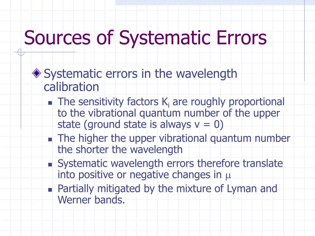 Sources of Systematic Errors • Systematic errors in the wavelength calibration • The sensitivity factors Ki are roughly proportional to the vibrational quantum number of the upper state (ground state is always v = 0) • The higher the upper vibrational quantum number the shorter the wavelength • Systematic wavelength errors therefore translate into positive or negative changes in m • Partially mitigated by the mixture of Lyman and Werner bands.