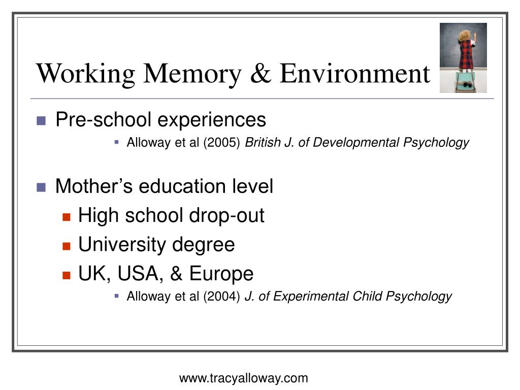 Working Memory & Environment • Pre-school experiences • Alloway et al (2005) British J. of Developmental Psychology • Mother’s education level • High school drop-out • University degree • UK, USA, & Europe • Alloway et al (2004) J. of Experimental Child Psychology www.tracyalloway.com