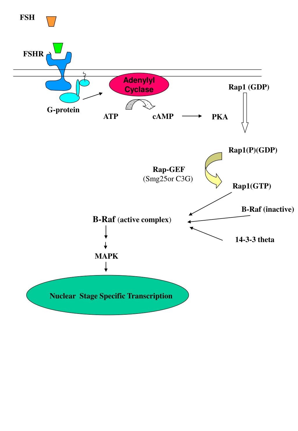 FSH FSHR Adenylyl Cyclase Rap1 (GDP) G-protein ATP cAMP PKA Rap1(P)(GDP) Rap-GEF (Smg25or C3G) Rap1(GTP) B-Raf (inactive) B-Raf (active complex) 14-3-3 theta MAPK Nuclear Stage Specific Transcription