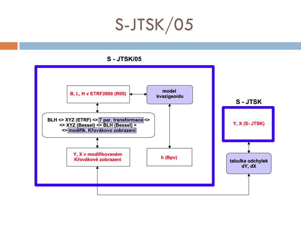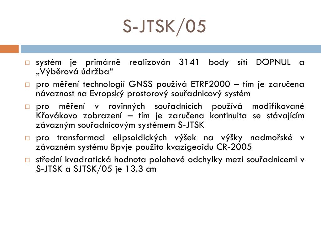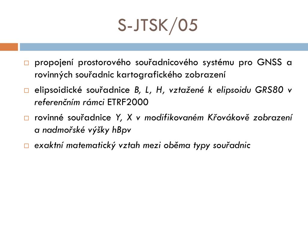 S-JTSK/05 • propojení prostorového souřadnicového systému pro GNSS a rovinných souřadnic kartografického zobrazení • elipsoidické souřadnice B, L, H, vztažené k elipsoidu GRS80 v referenčním rámci ETRF2000 • rovinné souřadnice Y, X v modifikovaném Křovákově zobrazení a nadmořské výšky hBpv • exaktní matematický vztah mezi oběma typy souřadnic