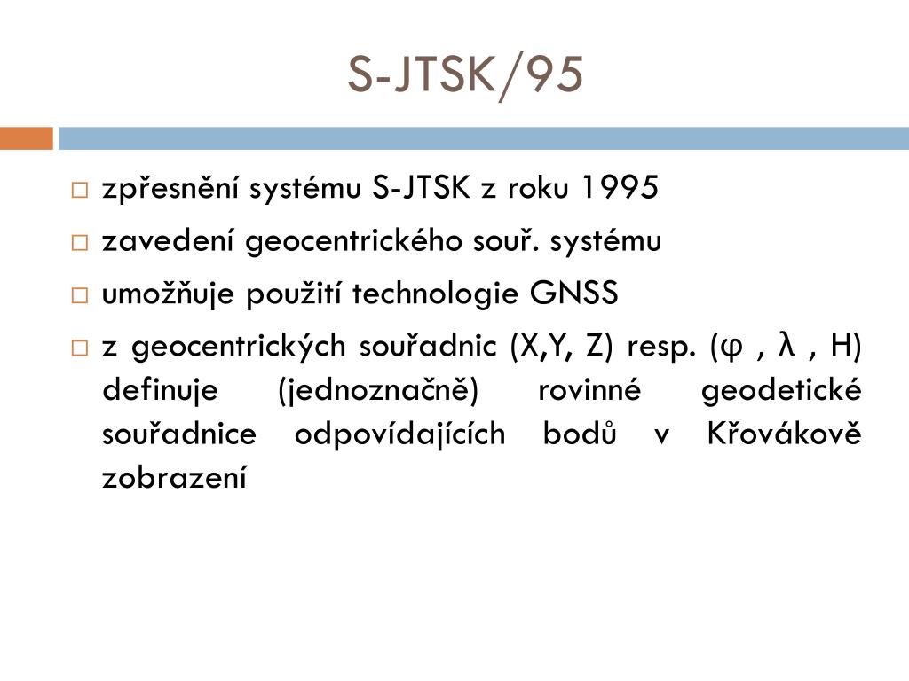 S-JTSK/95 • zpřesnění systému S-JTSK z roku 1995 • zavedení geocentrického souř. systému • umožňuje použití technologie GNSS • z geocentrických souřadnic (X,Y, Z) resp. (ϕ , λ , H) definuje (jednoznačně) rovinné geodetické souřadnice odpovídajících bodů v Křovákově zobrazení