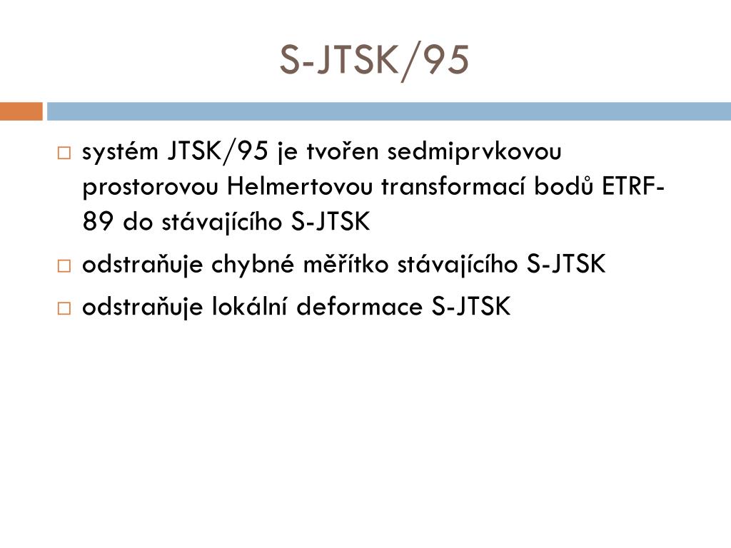 S-JTSK/95 • systém JTSK/95 je tvořen sedmiprvkovou prostorovou Helmertovou transformací bodů ETRF-89 do stávajícího S-JTSK • odstraňuje chybné měřítko stávajícího S-JTSK • odstraňuje lokální deformace S-JTSK