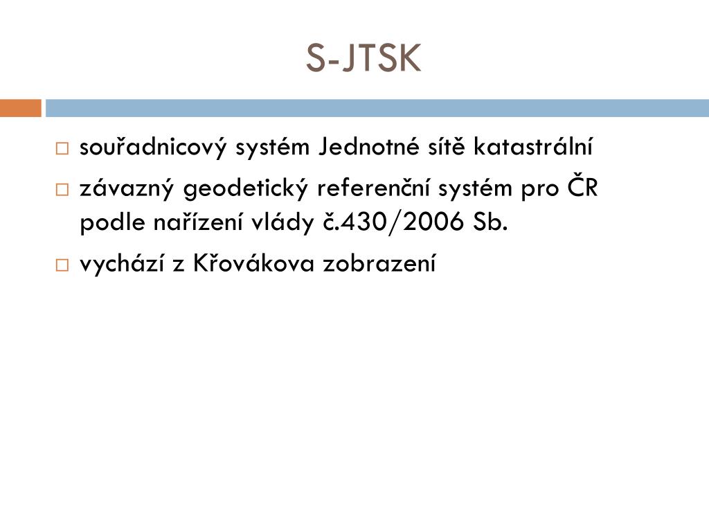 S-JTSK(95/05) diplomový seminář. Jan Andrle Brno 2014. S-JTSK. souřadnicový systém Jednotné sítě katastrální závazný geodetický referenční systém pro ČR podle nařízení vlády č.430/2006 Sb. vychází z Křovákova zobrazení. Křovákovo zozbrazení.