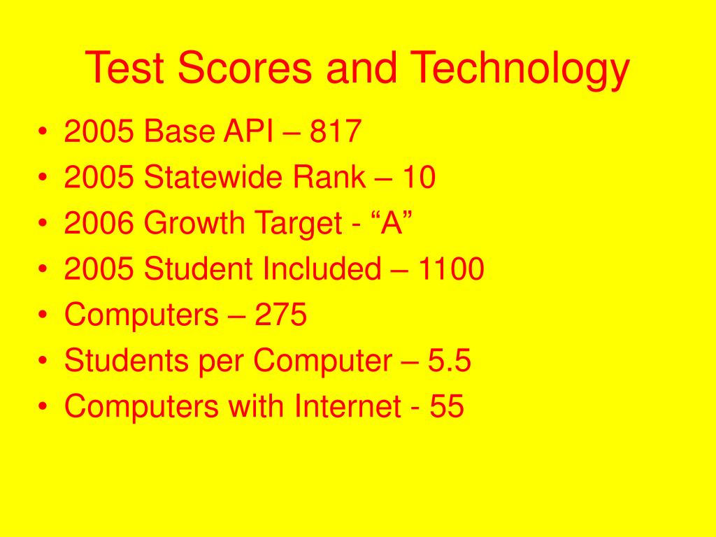 Test Scores and Technology • 2005 Base API – 817 • 2005 Statewide Rank – 10 • 2006 Growth Target - “A” • 2005 Student Included – 1100 • Computers – 275 • Students per Computer – 5.5 • Computers with Internet - 55