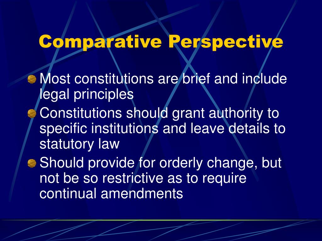 Comparative Perspective • Most constitutions are brief and include legal principles • Constitutions should grant authority to specific institutions and leave details to statutory law • Should provide for orderly change, but not be so restrictive as to require continual amendments