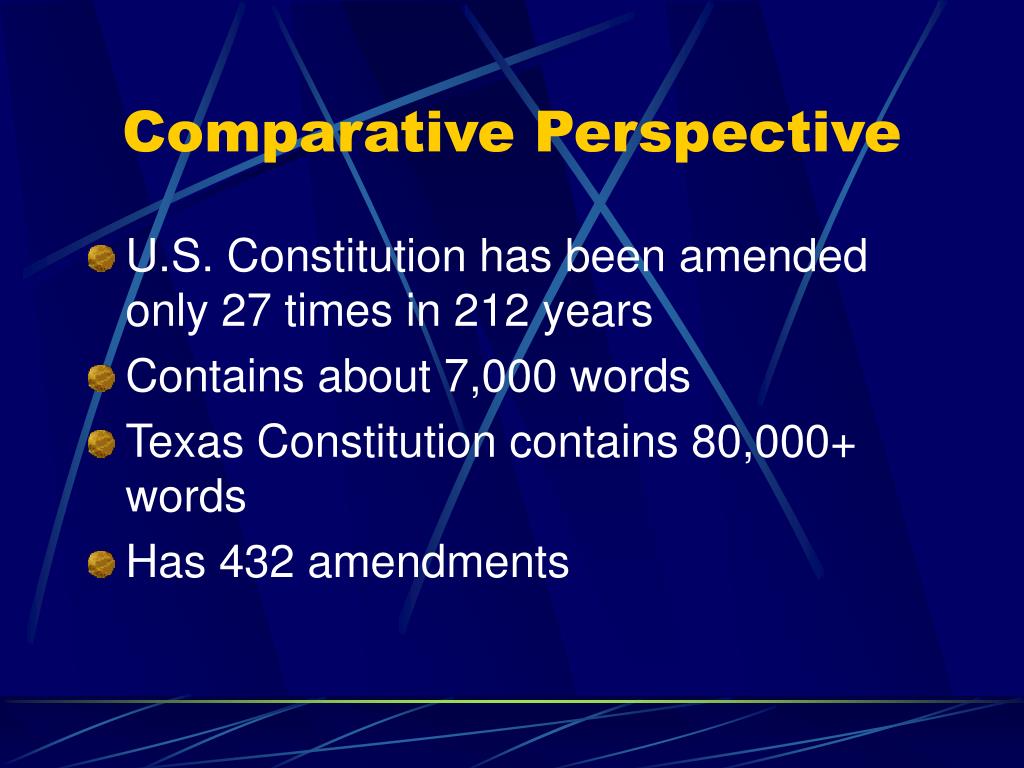 Comparative Perspective • U.S. Constitution has been amended only 27 times in 212 years • Contains about 7,000 words • Texas Constitution contains 80,000+ words • Has 432 amendments