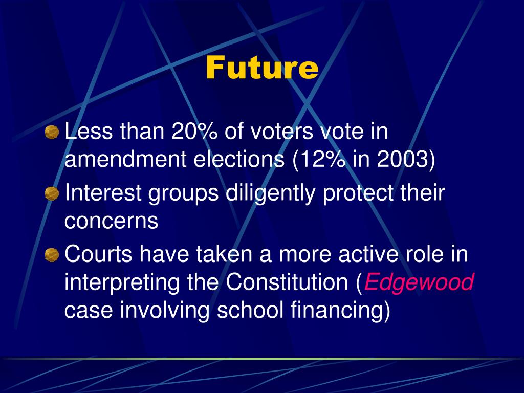Future • Less than 20% of voters vote in amendment elections (12% in 2003) • Interest groups diligently protect their concerns • Courts have taken a more active role in interpreting the Constitution (Edgewood case involving school financing)