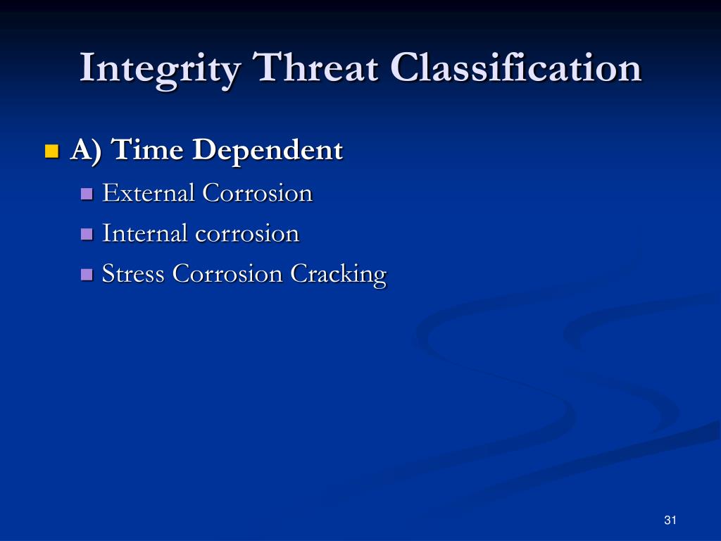 Integrity Threat Classification • A) Time Dependent • External Corrosion • Internal corrosion • Stress Corrosion Cracking