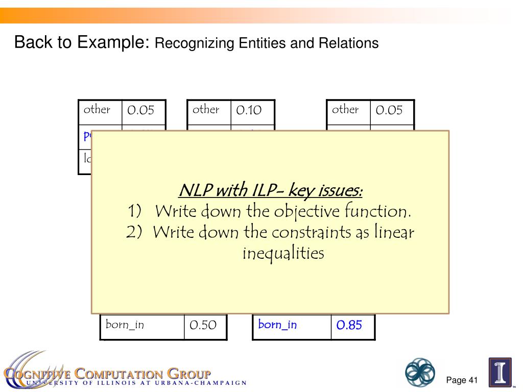 Back to Example: Recognizing Entities and Relations Dole ’s wife, Elizabeth , is a native of N.C. E1E2E3 R23 R12 • NLP with ILP- key issues: • Write down the objective function. • Write down the constraints as linear inequalities Page 41