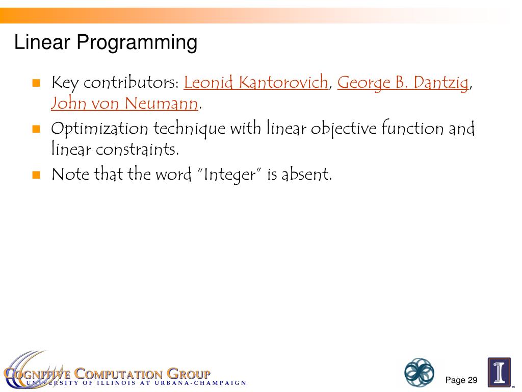 Linear Programming Key contributors: Leonid Kantorovich, George B. Dantzig, John von Neumann. Optimization technique with linear objective function and linear constraints. Note that the word “Integer” is absent.