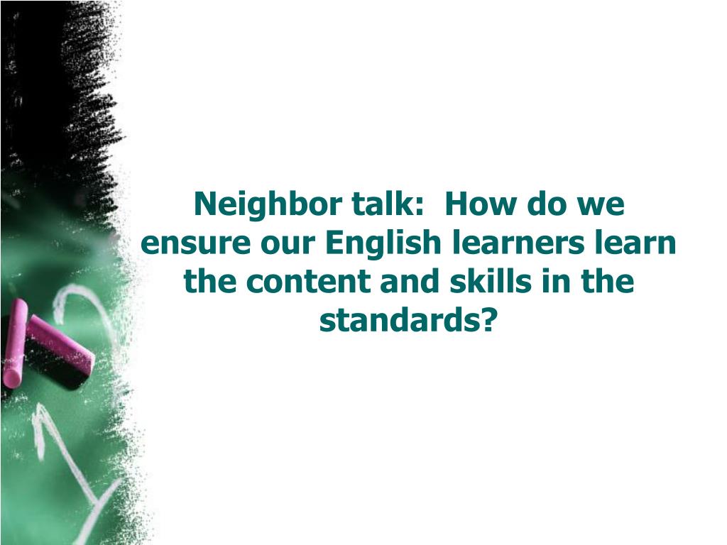 Neighbor talk: How do we ensure our English learners learn the content and skills in the standards?
